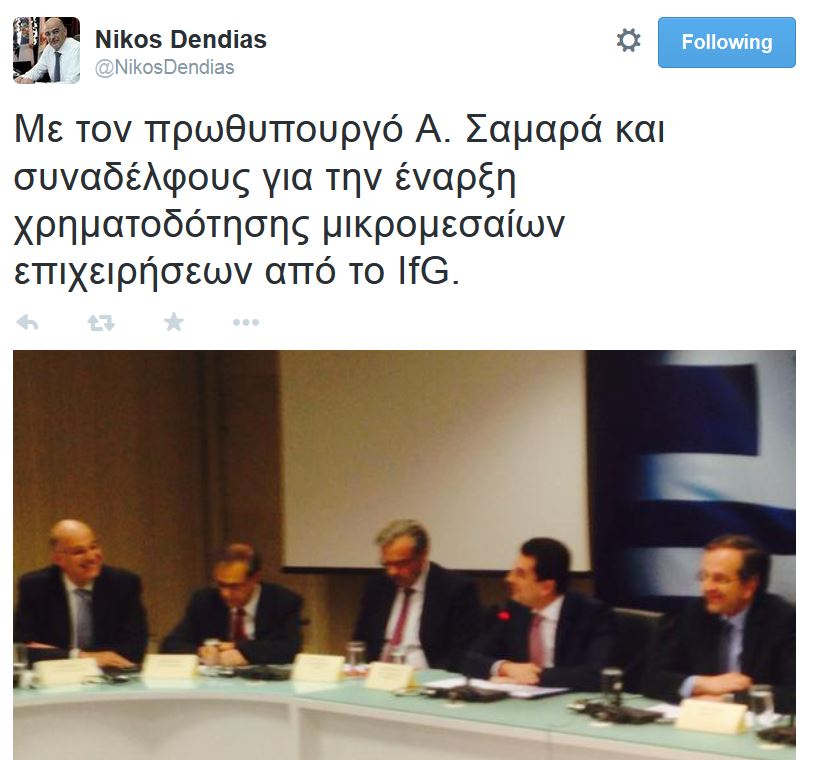 “Με τον πρωθυπουργό Α. Σαμαρά και συναδέλφους για την έναρξη χρηματοδότησης μικρομεσαίων επιχειρήσεων από το IfG”, έγραψε ο κ. Δένδιας στο Twitter.