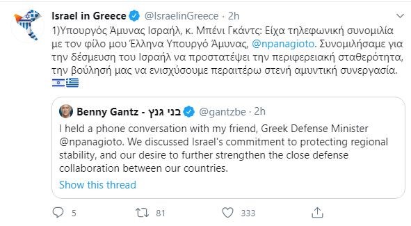 Νωρίτερα, ο Νίκος Παναγιωτόπουλος είχε τηλεφωνική επικοινωνία με τον Ισραηλινό ομόλογό του, Μπένι Γκάντς, ο οποίος προχώρησε σε καθαρή ανακοίνωση στήριξης της Ελλάδας έναντι της Τουρκίας στην Μεσόγειο. «Είχα τηλεφωνική συνομιλία με τον φίλο μου Έλληνα Υπουργό Άμυνας, Νίκο Παναγιωτόπουλο. Συνομιλήσαμε για την δέσμευση του Ισραήλ να προστατέψει την περιφερειακή σταθερότητα, την βούλησή μας να ενισχύσουμε περαιτέρω στενή αμυντική συνεργασία» έγραψε χαρακτηριστικά.