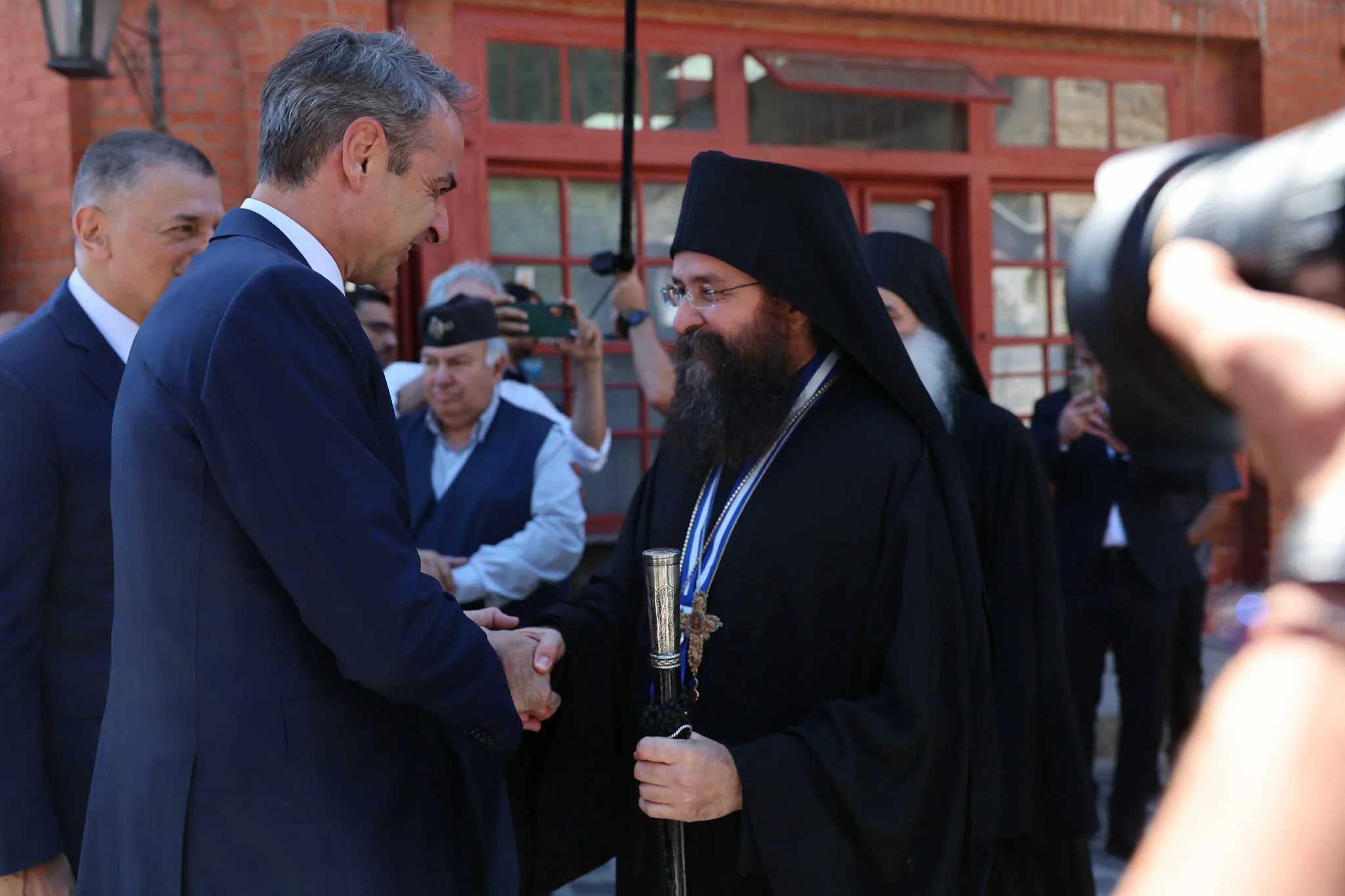 Τα μέλη της Διπλής Ιεράς Σύναξης (ηγούμενοι και αντιπρόσωποι των είκοσι μονών) υποδέχτηκαν τον πρωθυπουργό με επισημότητα.