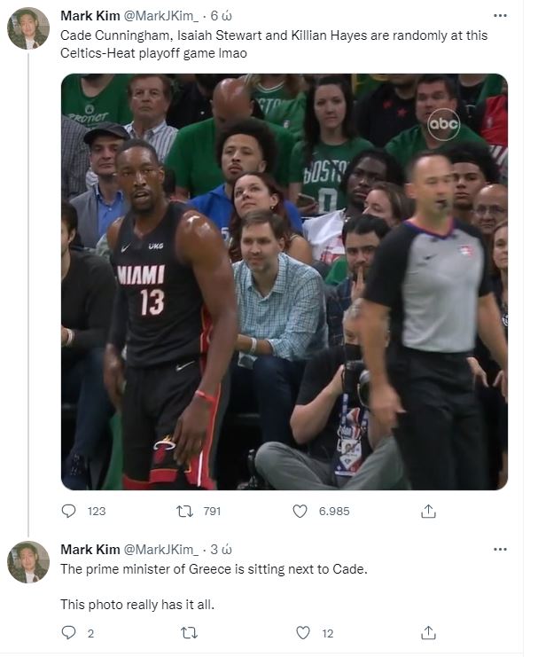 Όμως, οι Cade Cunningham, Isaiah Stewart και Killian Hayes ήταν επίσης στο Garden για να δουν τον τέταρτο τελικό της ανατολικής περιφέρειας του ΝΒΑ και ο Κυριάκος Μητσοτάκης κάθισε δίπλα τους με αποτέλεσμα το φωτογραφικό καρέ να ανέβει στον λογαριασμό στο Twitter γνωστού αθλητικού συντάκτη.