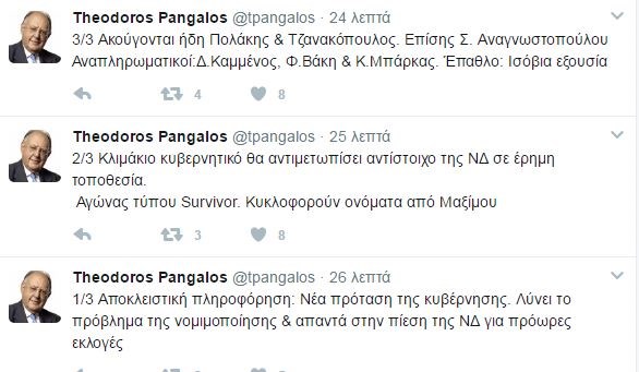 Μάχη τύπου Survivor προτείνει ο Θεόδωρος Πάγκαλος στην κυβέρνηση για να λυθούν οι διαφορές του ΣΥΡΙΖΑ με τη Νέα Δημοκρατία.«Αποκλειστική πληροφόρηση: Νέα πρόταση της Κυβέρνησης. Λύνει το πρόβλημα της νομιμοποίησης και απαντά στην πίεση της ΝΔ για πρόωρες εκλογές», αναφέρει στο πρώτο tweet ο Θεόδωρος Πάγκαλος.«Κλιμάκιο κυβερνητικό θα αντιμετωπίσει το αντίστοιχο της ΝΔ σε έρημη τοποθεσία. Αγώνας τύπου Survivor. Κυκλοφορούν ονόματα από Μαξίμου», συμπληρώνει και στο τελευταίο tweet σπεύδει να αναφέρει ποιοι θα είναι οι παίκτες από πλευράς Κυβέρνησης στο εν λόγω παιχνίδι.«Ακούγονται ήδη Πολάκης και Τζανακόπουλος. Επίσης Σ. Αναγνωστοπούλου. Αναπληρωματικοί: Δ. Καμμένος, Φ. Βάκη και Κ. Μπάρκας. Έπαθλο: Ισόβια εξουσία», καταλήγει ο κ. Πάγκαλος.Δείτε τα tweets του κ. Πάγκαλου: