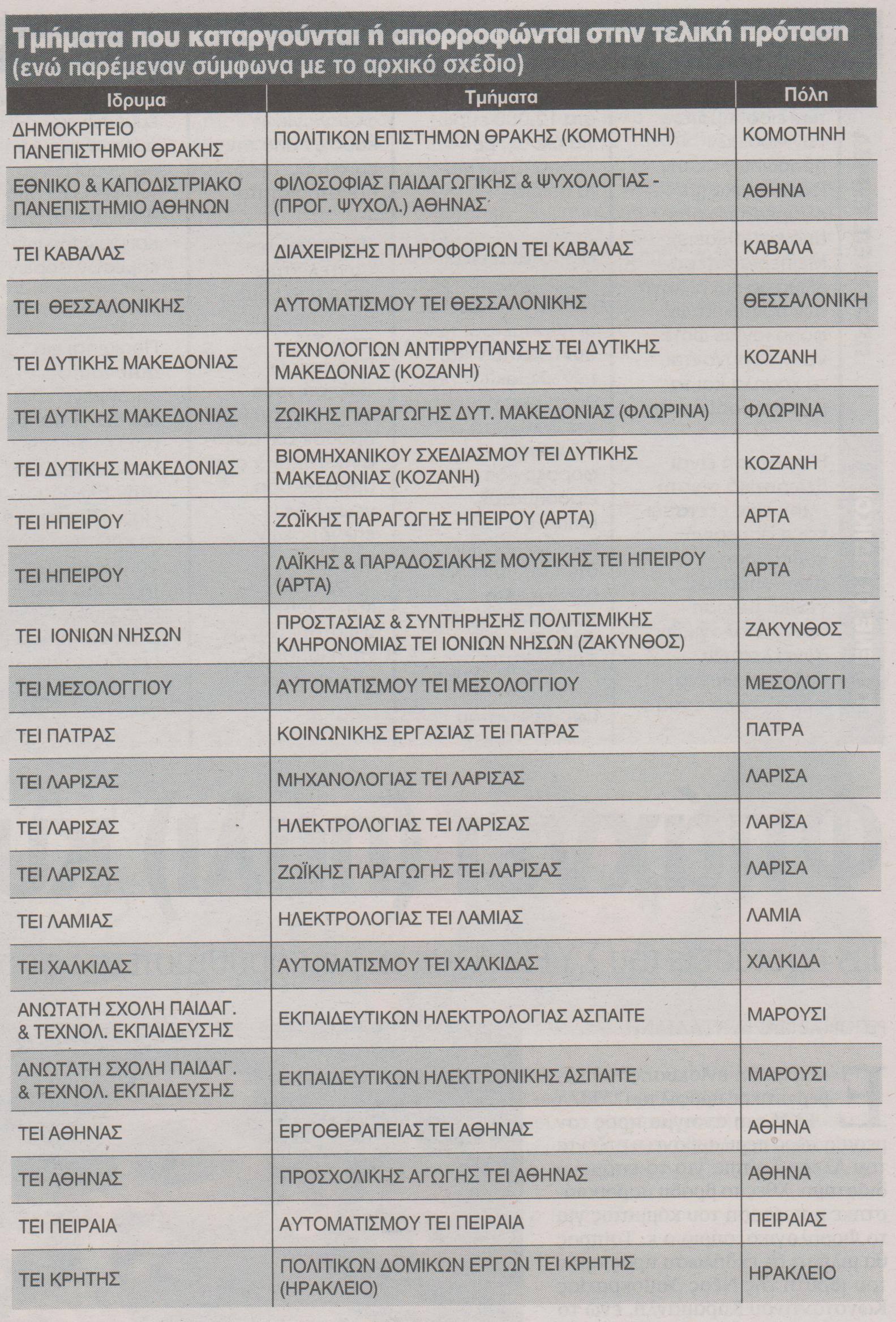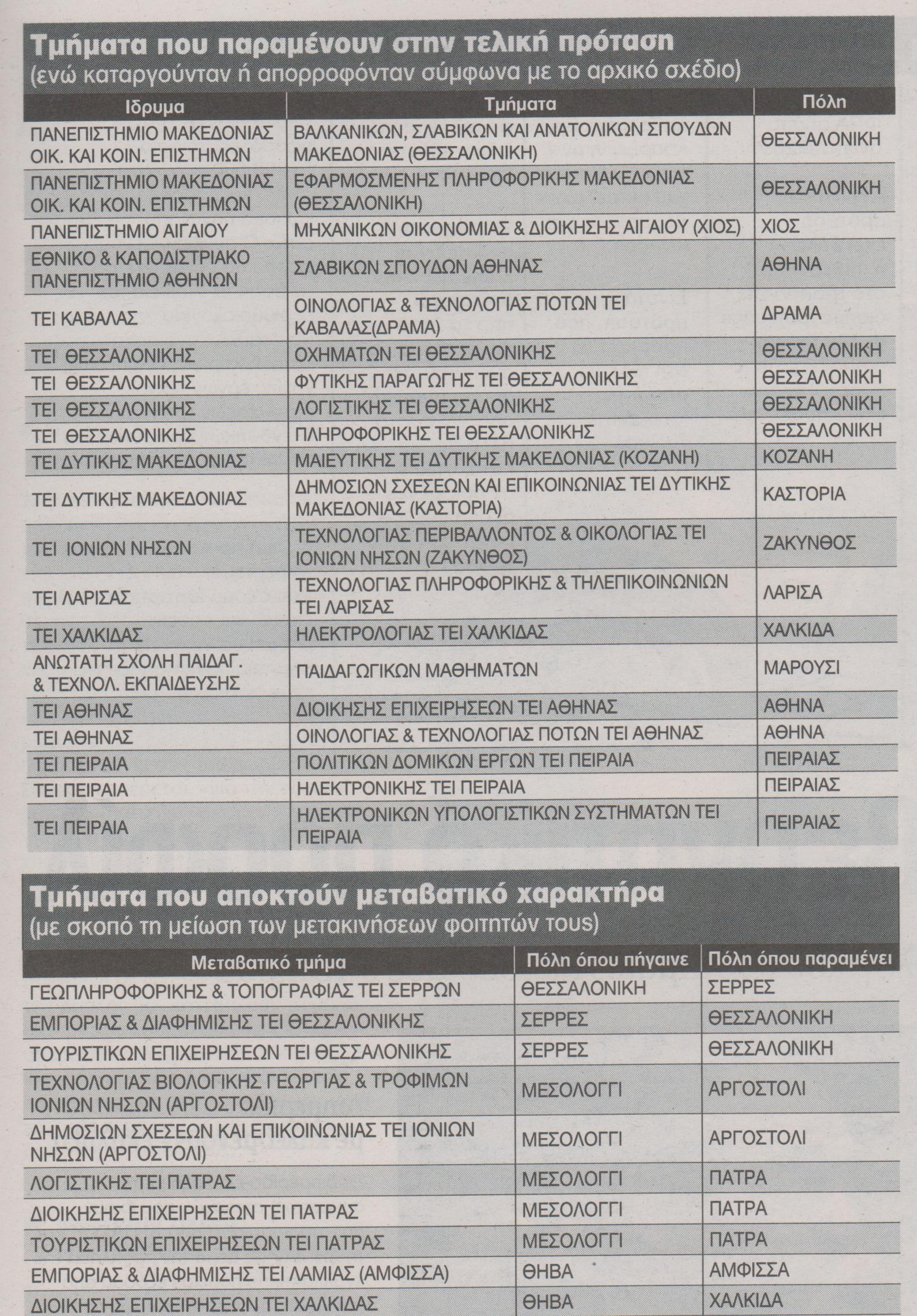Από το τελικό σχέδιο, προκύπτει μείωση κατά 4% στον αριθμό των εισακτέων σε ΑΕΙ και ΤΕΙ -λόγω της μείωσης των τμημάτων- ενώ δεν αλλάζει ο αριθμός διδασκόντων.