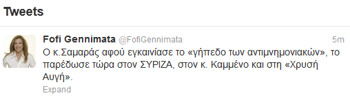 “Ο κ.Σαμαράς αφού εγκαινίασε το «γήπεδο των αντιμνημονιακών», το παρέδωσε τώρα στον ΣΥΡΙΖΑ, στον κ. Καμμένο και στη «Χρυσή Αυγή»”, έγραψε πριν από λίγο στο Twitter η εκπρόσωπος του ΠΑΣΟΚ Φώφη Γεννηματά σχολιάζοντας τη διακαναλική συνέντευξη Τύπου του Αντώνη Σαμαρά..”Ο κ. Σαμαράς αφού οδήγησε τη χώρα σε πρόωρες εκλογές γιατί πίστευε ότι θα έχει αυτοδυναμία, τώρα μιλάει για εθνική συνεννόηση”, έγραψε στη συνέχεια.
