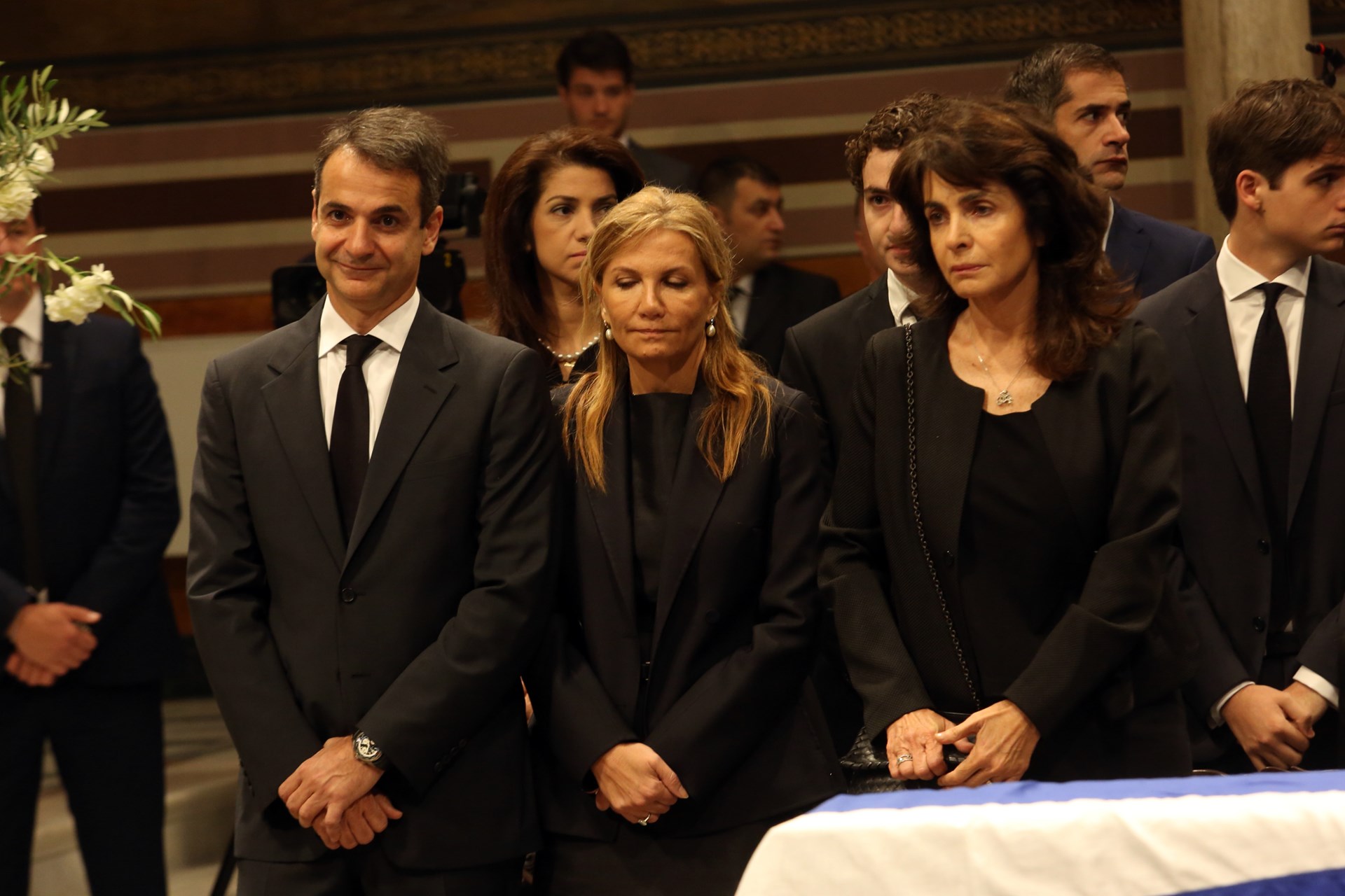 Μαζί της ήταν και η αδελφή της Αικατερίνη Μητσοτάκη. Λίγα λεπτά αργότερα έφτασαν τα παιδιά της Ντόρας Μπακογιάννη, Αλεξία και Κώστας Μπακογιάννης, και στη συνέχεια ο πρόεδρος της Νέας Δημοκρατίας Κυριάκος Μητσοτάκης με τη σύζυγό του Μαρέβα.
