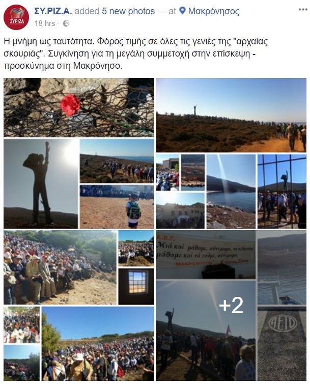 Ανάμεσα στους παρευρισκόμενους ήταν υπουργοί, βουλευτές και στελέχη της κυβέρνησης και του ΣΥΡΙΖΑ, όπως ο υπουργός Εσωτερικών Πάνος Σκουρλέτης, οι αναπληρωτές υπουργοί Οικονομίας Αλέξης Χαρίτσης και Εξωτερικών Γιώργος Κατρούγκαλος και ο γραμματέας της Κεντρικής Επιτροπής του κυβερνώντος κόμματος, Παναγιώτης Ρήγας. Ενδεικτικό της σημασίας που απέδωσε η Κουμουνδούρου στις εκδηλώσεις μνήμης και τιμής είναι η ανάρτηση στα μέσα κοινωνικής δικτύωσης: «Η μνήμη ως ταυτότητα. Φόρος τιμής σε όλες τις γενιές της “αρχαίας σκουριάς”. Συγκίνηση για τη μεγάλη συμμετοχή στην επίσκεψη – προσκύνημα στη Μακρόνησο».