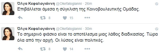 “Το σημερινό φιάσκο είναι το αποτέλεσμα μιας λάθος διαδικασίας. Τώρα όλα από την αρχή. Οι λύσεις είναι πολιτικές. Επιβάλλεται άμεσα η σύγκληση της Κοινοβουλευτικής Ομάδας” έγραψε στο Twitter.