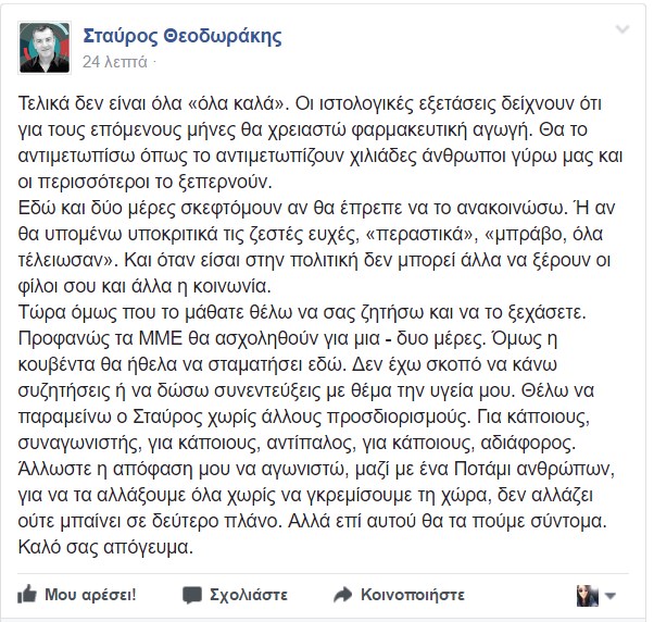 «Τελικά δεν είναι όλα “όλα καλά”. Οι ιστολογικές εξετάσεις δείχνουν ότι για τους επόμενους μήνες θα χρειαστώ φαρμακευτική αγωγή. Θα το αντιμετωπίσω όπως το αντιμετωπίζουν χιλιάδες άνθρωποι γύρω μας και οι περισσότεροι το ξεπερνούν. Εδώ και δύο μέρες σκεφτόμουν αν θα έπρεπε να το ανακοινώσω. Ή αν θα υπομένω υποκριτικά τις ζεστές ευχές, “περαστικά”, “μπράβο, όλα τέλειωσαν”. Όμως, από τη στιγμή που είσαι στην πολιτική δεν μπορεί άλλα να ξέρουν οι φίλοι σου και άλλα η κοινωνία. Τώρα, όμως, που το μάθατε θέλω να σας ζητήσω και να το ξεχάσετε. Προφανώς τα ΜΜΕ θα ασχοληθούν για μια-δυο μέρες. Όμως, η κουβέντα θα ήθελα να σταματήσει εδώ. Δεν έχω σκοπό να κάνω συζητήσεις ή να δώσω συνεντεύξεις με θέμα την υγεία μου. Θέλω να παραμείνω ο Σταύρος, χωρίς άλλους προσδιορισμούς. Για κάποιους συναγωνιστής, για κάποιους αντίπαλος, για κάποιους αδιάφορος. Άλλωστε, η απόφαση μου να αγωνιστώ, μαζί με ένα Ποτάμι ανθρώπων, για να τα αλλάξουμε όλα χωρίς να γκρεμίσουμε τη χώρα, δεν αλλάζει, ούτε μπαίνει σε δεύτερο πλάνο. Αλλά επί αυτού θα τα πούμε σύντομα. Καλό σας απόγευμα».