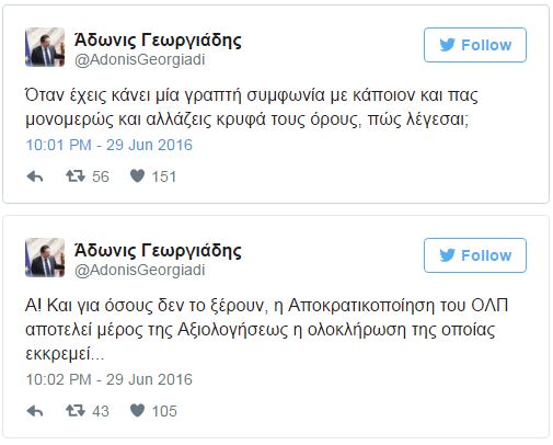 «Όταν έχεις κάνει μία γραπτή συμφωνία με κάποιον και πας μονομερώς και αλλάζεις τους όρους, πως λέγεσαι;» αναρωτήθηκε αρχικά και στη συνέχεια, σε δεύτερο tweet, έγραψε: «Α! Και για όσους δεν το ξέρουν, η αποκρατικοποίηση του ΟΛΠ αποτελεί μέρος της Αξιολογήσεως η ολοκλήρωση της οποίας εκκρεμεί…».