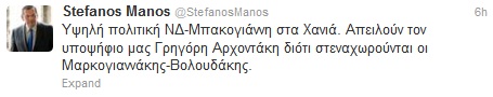 Συκοφαντικό και αστήρικτο, ως προς αυτόν, χαρακτηρίζει ο Μανούσος Βολουδάκης το σχόλιο του Στέφανου Μάνου στο twitter: