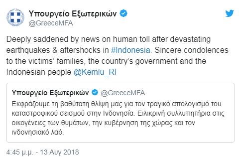 Σε ανάρτησή του στο Twitter, το υπουργείο Εξωτερικών εκφράζει επίσης ειλικρινή συλλυπητήρια στις οικογένειες των θυμάτων, την κυβέρνηση της χώρας και τον ινδονησιακό λαό.