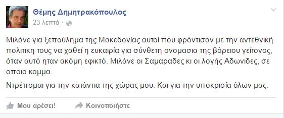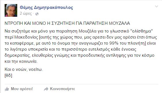 Τη στήριξη του στον αναπληρωτή υπουργό Μεταναστευτικής Πολιτικής, Γιάννη Μουζάλα, εκφράζει με αναρτήσεις του στο Facebook, ο Θέμης Δημητρακόπουλος, σύμβουλος του υπουργείου Παιδείας και Θρησκευμάτων, αποκαλώντας μάλιστα και ο ίδιος τα Σκόπια, ως “Μακεδονία”.