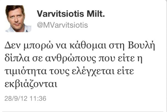 Ο Μιλτιάδης Βαρβιτσιώτης με ένα tweet εξαπολύει τα πυρά του κατά όσων πολιτικών ελέγχονται από τις αρχές. Δείτε τι έγραψε στο twitter του: