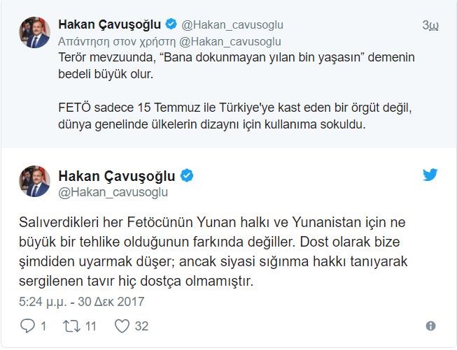 Μέσω Twitter ο Χακάν Τσαβούσογλου, μίλησε ευθέως για μια μη φιλική ενέργεια από την ελληνική πλευρά.