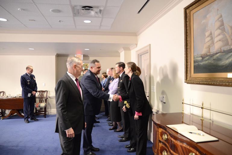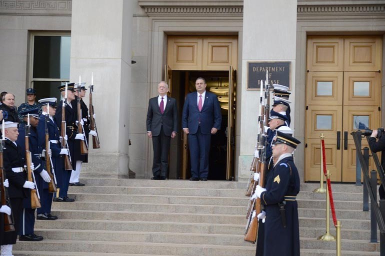 Κάλεσα τον υπουργό να επισκεφτεί την Ελλάδα επισημαίνοντας του ότι 27 χρόνια έχει να επισκεφτεί υπουργός άμυνας των ΗΠΑ την Ελλάδα. Δέχτηκε την πρόσκληση και μάλιστα μου έδωσε το χέρι του εκείνη την στιγμή. Και του είπα ότι είναι τιμή μας να επισκεφτεί και την Σούδα, για την οποία κάναμε μεγάλη κουβέντα σε σχέση με τις δυνατότητες που υπάρχουν για την επέκταση της βάσεως και της σημασίας της για την συμμαχία.Μιλήσαμε για τα εξοπλιστικά. Εξηγήσαμε την οικονομική κατάσταση της χώρας και ζητήσαμε από την μεριά των ΗΠΑ να υπάρξει ένα πλάνο ώστε να εξυγχρονιστεί η χώρα, αλλά χωρίς να επιβαρύνει τον προϋπολογισμό. Νομίζω πως είμαστε σε ένα πολύ καλό σημείο.Θεωρώ ότι αρχίζει μια νέα μέρα για τις ελληνοαμερικανικές σχέσεις και στον τομέα της άμυνας.Είμαι πολύ ευτυχής διότι, ενώ με την προηγούμενη κυβέρνηση, παρότι σας είπα ότι και ο ίδιος ο πρόεδρος είχε βοηθήσει, είχαν την αντίληψη περί της παγκοσμιοποιήσεως. Αυτή τη στιγμή η διοίκηση Τραμπ αντιλαμβάνεστε τον ιδιαίτερο ρόλο του έθνους κράτους όπως επίσης και την ιδιαιτερότητα που είναι τα κράτη με ιστορία και ιδιαίτερους δεσμούς να αναπτύξουν τις συνεργασίες. Γνωρίζουν καλά ότι η στενή συνεργασία της Ελλάδας με το Ισραήλ αλλά και παράλληλα η δυνατότητα να μιλά την ίδια γλώσσα με τις ίδιες χώρες της αραβικής χερσονήσου θα βοηθήσει στο να μπορέσουμε να εργαστούμε όχι μόνο για εμάς αλλά και την ειρήνη και την δημοκρατία στην ευρύτερη περιοχή. Το ίδιο συμβαίνει και στα Βαλκάνια. Είναι αλήθεια πως η Ελλάδα έχει την δυνατότητα να μιλά ως ένα χώρα μέλος του ΝΑΤΟ της ΕΕ, αλλά και ως ένα μέλος αυτό που ονομάζουμε της καθημας ανατολής.
