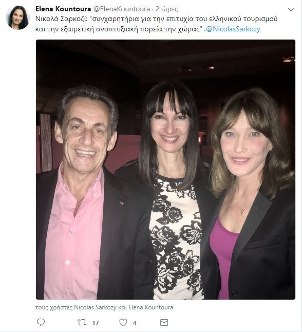 Συνάντηση με τον Νικολά Σαρκοζί και τη σύζυγό του Κάρλα Μπρούνι, είχε η υπουργός Τουρισμού Έλενα Κουντουρά, στο πλαίσιο της επίσκεψής τους και της συναυλίας της κας Μπρούνι στην Αθήνα.