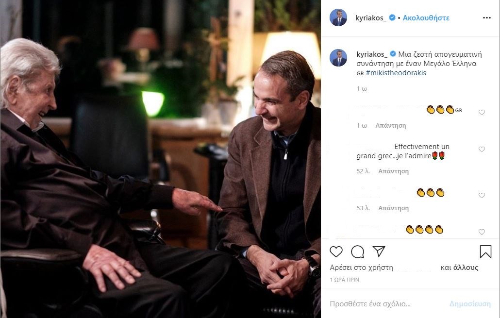 “Μια ζεστή απογευματινή συνάντηση με έναν Μεγάλο Έλληνα” γράφει στη λεζάντα που συνοδεύει τη φωτογραφία του με τον σπουδαίο Μίκη Θεοδωράκη, ο Πρωθυπουργός Κυριάκος Μητσοτάκης.