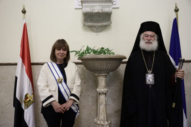 Η κυρία Σακελλαροπούλου εξήρε την προσήλωση με την οποία ο Πατριάρχης, παρά τις προκλήσεις που αντιμετωπίζει, φέρει εις πέρας την αποστολή του ως πνευματικός καθοδηγητής του ποιμνίου στην αφρικανική ήπειρο, αποτελώντας άξιο πρεσβευτή της ελληνορθόδοξης παράδοσης. Τόνισε επίσης, ότι η ελληνική πολιτεία εκτιμά την καθοριστική συμβολή του Πατριαρχείου στη διατήρηση της καλής επικοινωνίας με την αιγυπτιακή πλευρά.
