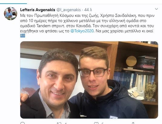 «Με τον Πρωταθλητή Κόσμου και της ζωής, Χρήστο Σανδαλάκη, που πριν από 10 ημέρες πήρε το χάλκινο μετάλλιο με την ελληνική ομάδα στο ομαδικό Tandem σπριντ, στον Καναδά. Τον συνεχάρη από κοντά και του ευχήθηκα να φτάσει ως το @Tokyo2020. Να μας χαρίσει μετάλλιο κι εκεί» αναφέρει σε ανάρτησή του στο twitter ο υφυπουργός Αθλητισμού.