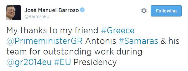 «Συγχαίρω τον Αντ. Σαμαρά για την επιτυχημένη Προεδρία της Ελλάδας, παρά τη δύσκολη περίοδο που περνά η χώρα», τόνισε ο Χ. Β. Ρομπάι, ενώ από την πλευρά του ο Ζ. Μ. Μπαρόζο υπογράμμισε το «εντυπωσιακό έργο» της ελληνικής Προεδρίας, το οποίο όπως είπε ήταν «πέραν του τυπικού». Ο κ. Μπαρόζο τόνισε ότι το έργο της ελληνικής Προεδρίας αποτελεί «πραγματική απόδειξη της δέσμευσης της Ελλάδας στο ευρωπαϊκό εγχείρημα».