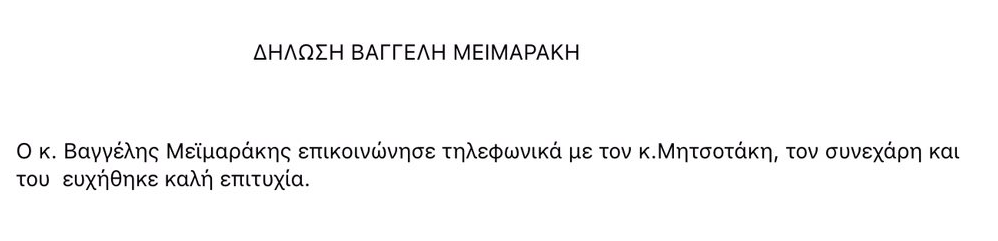 Ο Ευάγγελος Μεϊμαράκης επικοινώνησε τηλεφωνικά με τον Κυριάκο Μητσοτάκη και τον συνεχάρη για τη νίκη του, όπως μετέδωσε η Χριστίνα Κοραή στην έκτακτη πολιτική εκπομπή του Real Fm 97,8.