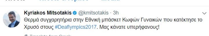 Τα θερμά του συγχαρητήρια στην Εθνική μπάσκετ Κωφών Γυναικών για την κατάκτηση του χρυσού μεταλλίου στους #Deaflympics2017, εκφράζει ο πρόεδρος της ΝΔ Κυριάκος Μητσοτάκης. Σε ανάρτησή του στο Twitter, ο κ. Μητσοτάκης αναφέρει: «Θερμά συγχαρητήρια στην Εθνική μπάσκετ Κωφών Γυναικών που κατέκτησε το Χρυσό στους #Deaflympics2017. Μας κάνατε υπερήφανους!».