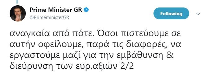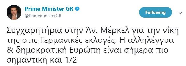 Συγχαρητήρια στην Άνγκελα Μέρκελ για την νίκη της στις γερμανικές εκλογές. Η αλληλέγγυα και δημοκρατική Ευρώπη είναι σήμερα πιο σημαντική και αναγκαία από πότε. Όσοι πιστεύουμε σε αυτήν οφείλουμε, παρά τις διαφορές, να εργαστούμε μαζί για την εμβάθυνση και διεύρυνση των ευρωπαϊκών αξιών, αναφέρει ο πρωθυπουργός Αλέξης Τσίπρας σε ανάρτησή του στο twitter για το αποτέλεσμα των γερμανικών εκλογών.
