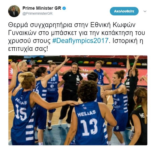 Σε ανάρτησή του στο Twitter, ο κ. Τσίπρας χαρακτηρίζει ιστορική την επιτυχία, σημειώνοντας χαρακτηριστικά: «Θερμά συγχαρητήρια στην Εθνική Κωφών Γυναικών στο μπάσκετ για την κατάκτηση του χρυσού στους #Deaflympics2017. Ιστορική η επιτυχία σας!».