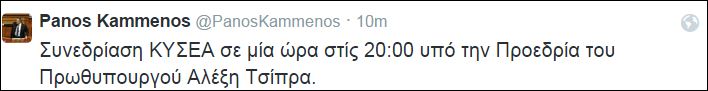 Συνεδρίαση του Κυβερνητικού Συμβουλίου Εξωτερικών και Άμυνας θα πραγματοποιηθεί σε λίγη ώρα, υπό τον Πρωθυπουργό Αλέξη Τσίπρα, όπως έγραψε στο twitter ο υπουργός Εθνικής Άμυνας, Πάνος Καμμένος.