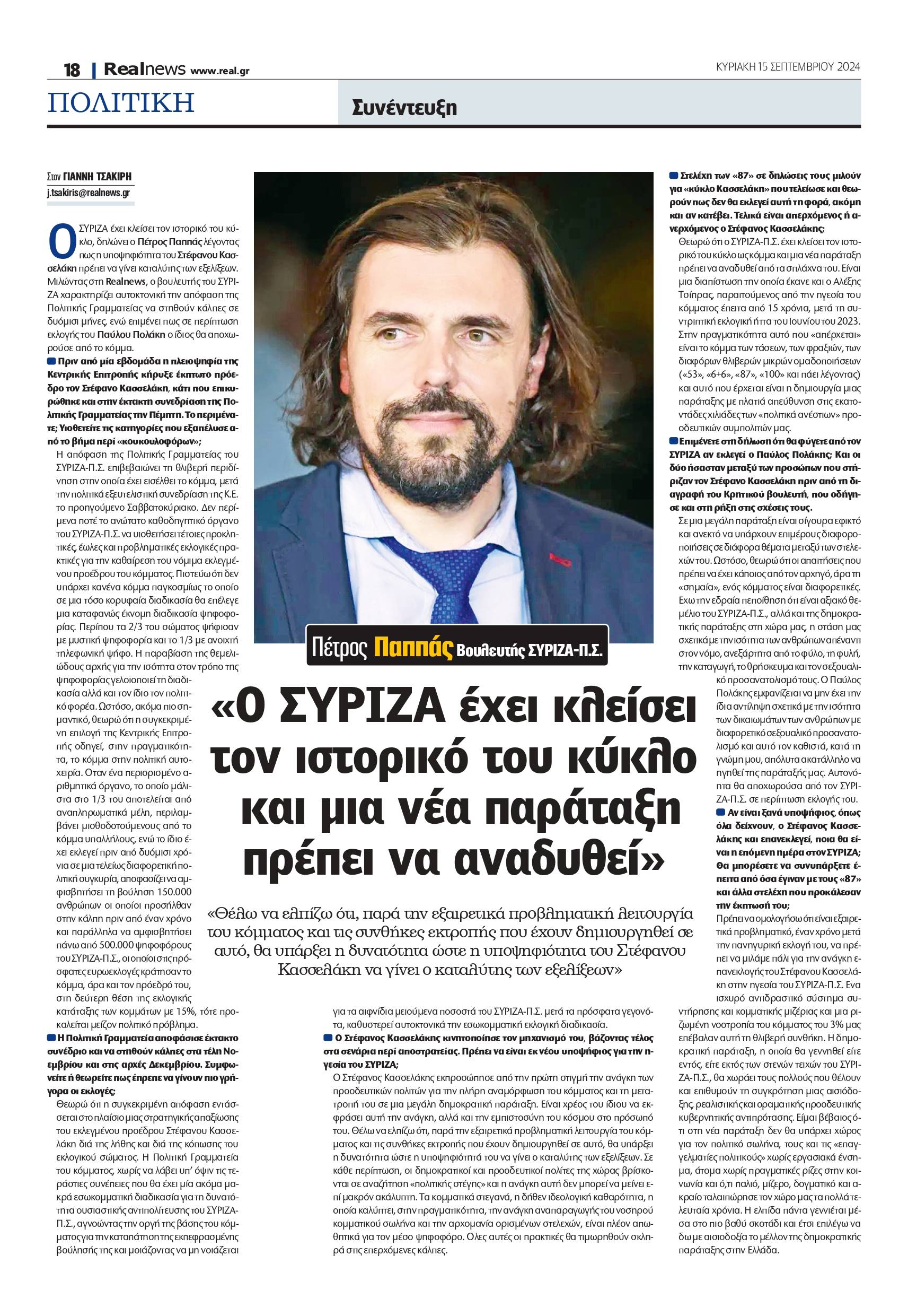 Ο ΣΥΡΙΖΑ έχει κλείσει τον ιστορικό του κύκλο, δηλώνει ο Πέτρος Παππάς λέγοντας πως η υποψηφιότητα του Στέφανου Κασσελάκη πρέπει να γίνει καταλύτης των εξελίξεων. Μιλώντας στη Realnews, ο βουλευτής του ΣΥΡΙΖΑ χαρακτηρίζει αυτοκτονική την απόφαση της Πολιτικής Γραμματείας να στηθούν κάλπες σε δυόμισι μήνες, ενώ επιμένει πως σε περίπτωση εκλογής του Παύλου Πολάκη ο ίδιος θα αποχωρούσε από το κόμμα.