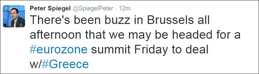 Έντονη είναι η φήμη στους διαδρόμους τις Βρυξέλλες ότι υπάρχει πιθανότητα να πραγματοποιηθεί Σύνοδος Κορυφής την Παρασκευή με θέμα την Ελλάδα, σύμφωνα με τον δημοσιογράφο των Financial Times, Peter Spiegel.