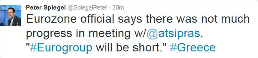 Σύμφωνα με τον δημοσιογράφο Ευρωπαίος αξιωματούχος υπογράμμισε ότι η αποψινή συνεδρίαση του Eurogroup θα είναι σύντομη καθώς δεν υπήρξε πρόοδος στη συνάντηση των επικεφαλής των θεσμών με τον Πρωθυπουργό Αλέξη Τσίπρα.
