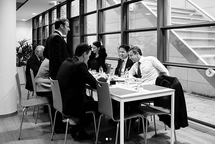 Μία φωτογραφία από «ένα σύντομο διάλειμμα ανάμεσα σε μαραθώνιες συναντήσεις» ανήρτησε στον προσωπικό του λογαριασμό στο Instagram ο Πρωθυπουργός Κυριάκος Μητσοτάκης.Στο τραπέζι μαζί με τον Πρωθυπουργό βρίσκονται ο Γάλλος Πρόεδρος Εμανουέλ Μακρόν, ο Πρωθυπουργός της Ισπανίας Πέδρο Σάντσεθ, ο Πρωθυπουργός της Ιταλίας Τζουζέπε Κόντε με τον Κυριάκο Μητσοτάκη να έχει «ταγκάρει» επίσης την Γερμανίδα Καγκελάριο Άνγκελα Μέρκελ, τον Πρωθυπουργό της Πορτογαλίας Αντόνιο Κόστα και την Πρωθυπουργό του Βελγίου Σόφι Βίλμες.