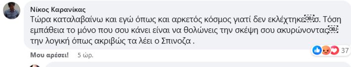 «Τώρα καταλαβαίνω και εγώ όπως και αρκετός κόσμος γιατί δεν εκλέχτηκες. Τόση εμπάθεια το μόνο που σου κάνει είναι να θολώνεις την σκέψη σου ακυρώνοντας την λογική όπως ακριβώς τα λέει ο Σπινοζα», γράφει ο Νίκος Καρανίκας.