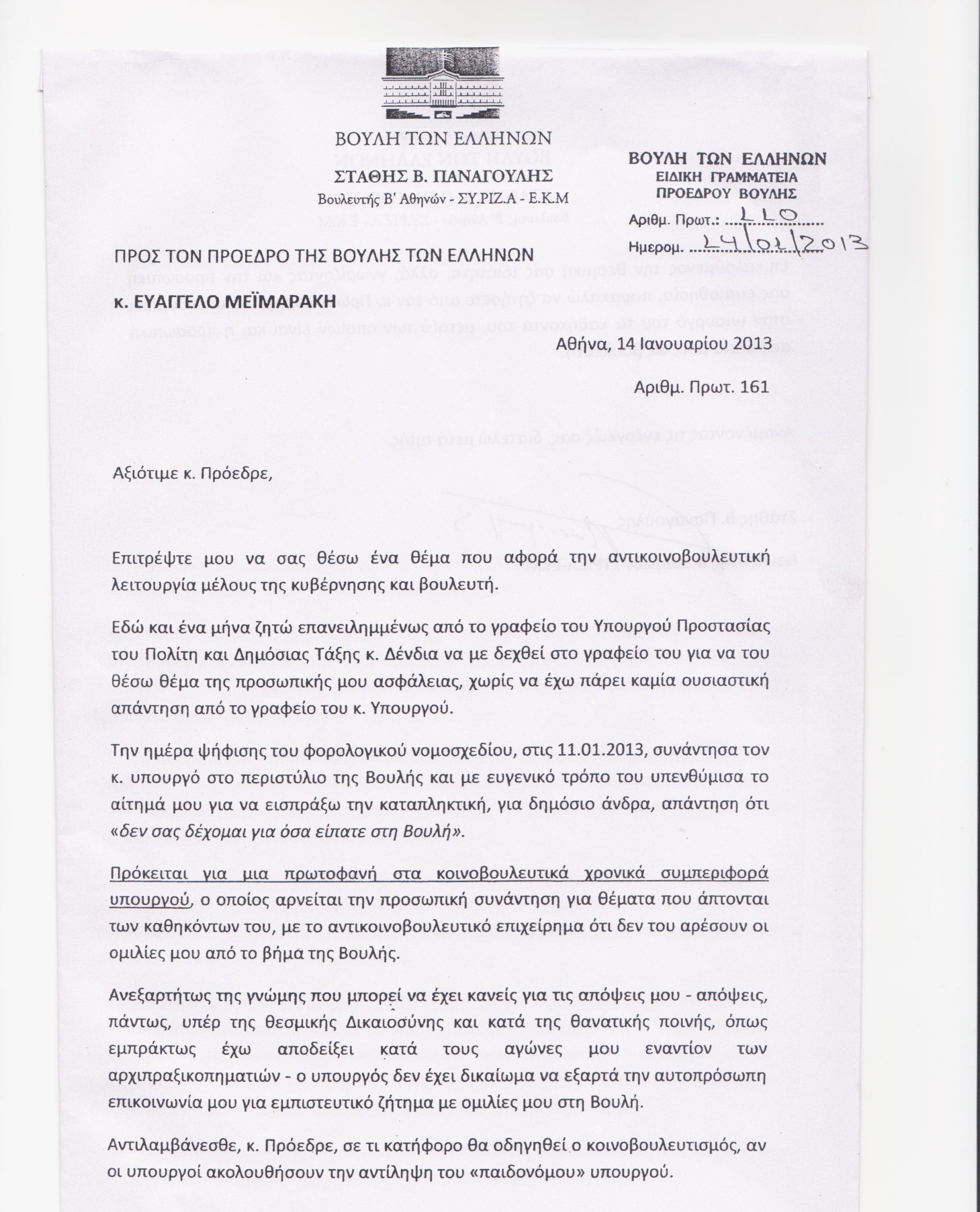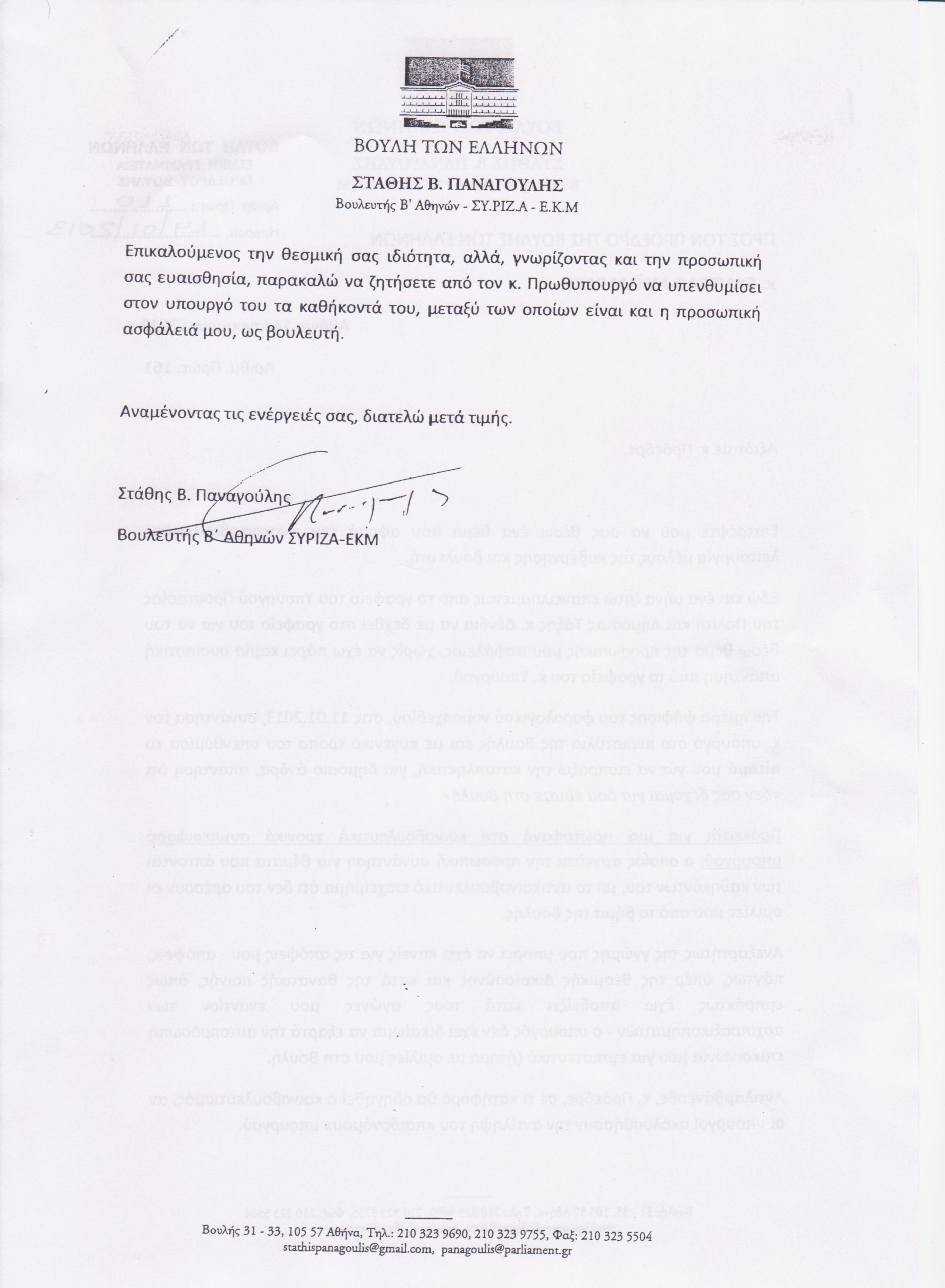 Ακολουθεί η επιστολή που έστειλε ο βουλευτής του ΣΥΡΙΖΑ, Σ. Παναγούλης, στον κ. Μεϊμαράκη: