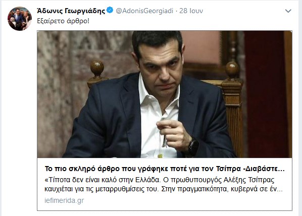 Δριμεία επίθεση στον Άδωνι Γεωργιάδη εξαπέλυσε το βράδυ της Παρασκευής ο ΣΥΡΙΖΑ μετά την ανάρτησή στο λογαριασμό του στο Twitter του δημοσιεύματος της γερμανικής εφημερίδας Frankfurter Allgemeine Sonntagszeitung που χαρακτήριζε την Ελλάδα ως τριτοκοσμική χώρα και