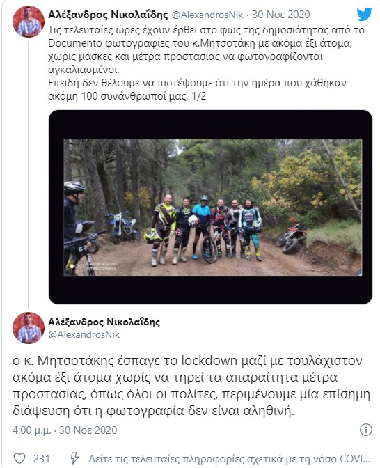 Με διπλή του ανάρτηση στο Twitter ο αναπληρωτής εκπρόσωπος του ΣΥΡΙΖΑ, Αλέξανδρος Νικολαΐδης σημειώνει: «Επειδή δεν θέλουμε να πιστέψουμε ότι την ημέρα που χάθηκαν ακόμη 100 συνάνθρωποί μας, ο κ. Μητσοτάκης έσπαγε το lockdown μαζί με τουλάχιστον ακόμα έξι άτομα χωρίς να τηρεί τα απαραίτητα μέτρα προστασίας, όπως όλοι οι πολίτες, περιμένουμε μία επίσημη διάψευση ότι η φωτογραφία δεν είναι αληθινή.»