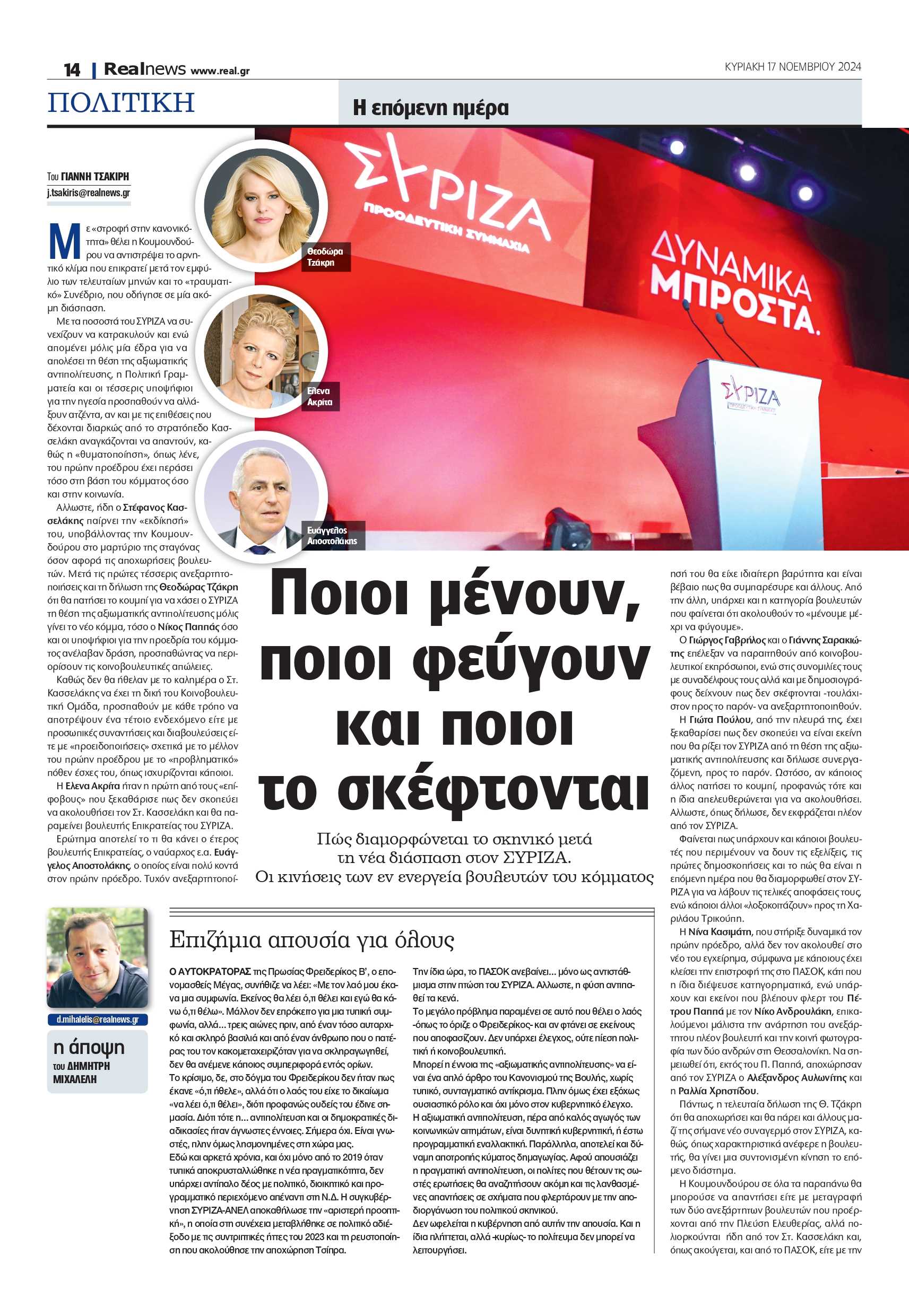 Η Έλενα Ακρίτα ήταν η πρώτη από τους «επίφοβους» που ξεκαθάρισε πως δεν σκοπεύει να ακολουθήσει τον Στ. Κασσελάκη και θα παραμείνει βουλευτής Επικρατείας του ΣΥΡΙΖΑ. Ερώτημα αποτελεί το τι θα κάνει ο έτερος βουλευτής Επικρατείας, ο ναύαρχος ε.α. Ευάγγελος Αποστολάκης, ο οποίος είναι πολύ κοντά στον πρώην πρόεδρο. Τυχόν ανεξαρτητοποίησή του θα είχε ιδιαίτερη βαρύτητα και είναι βέβαιο πως θα συμπαρέσυρε και άλλους. Από την άλλη, υπάρχει και η κατηγορία βουλευτών που φαίνεται ότι ακολουθούν το «μένουμε μέχρι να φύγουμε».
