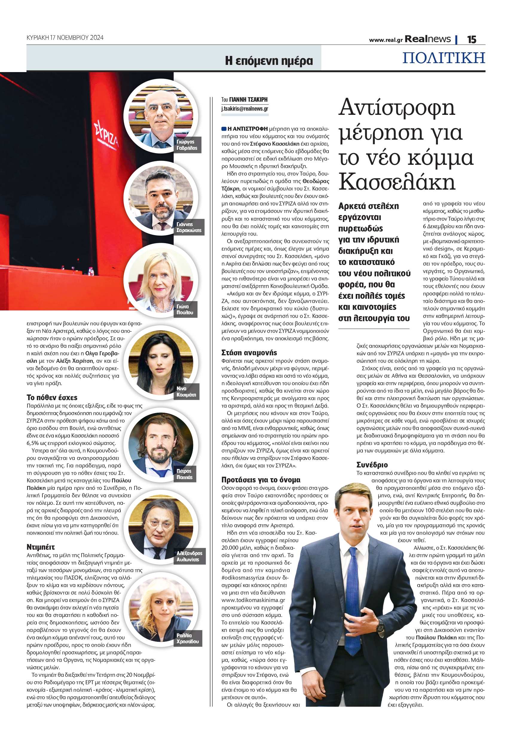 Άλλωστε, ο Στ. Κασσελάκης θέλει στην πρώτη γραμμή τα μέλη και όχι τα όργανα και έχει δώσει σαφείς εντολές αυτό να αποτυπώνεται και στην ιδρυτική διακήρυξη αλλά και στο καταστατικό. Πέρα από τα οργανωτικά, ο Στ. Κασσελάκης «τρέχει» και με τις νομικές του υποθέσεις, καθώς ετοιμάζεται να προσφύγει στη Δικαιοσύνη εναντίον του Παύλου Πολάκη και της Πολιτικής Γραμματείας για τα όσα έχουν υπαινιχθεί ή υποστηρίξει σχετικά με το πόθεν έσχες που έχει καταθέσει. Μάλιστα, πίσω από τις συγκεκριμένες επιθέσεις, βλέπει την Κουμουνδούρου, η οποία του βάζει εμπόδια προκειμένου να τα παρατήσει και να μην προχωρήσει στην ίδρυση του κόμματος που έχει εξαγγείλει.