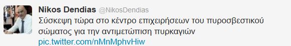 Σε εξέλιξη βρίσκεται σύσκεψη στο κέντρο επιχειρήσεων του πυροσβεστικού σώματος για την αντιμετώπιση πυρκαγιών, υπό την παρουσία του υπουργού Δημόσιας Τάξης και Προστασίας του Πολίτη, Νίκου Δένδια, όπως ενημέρωσε ο ίδιος μέσω Twitter.