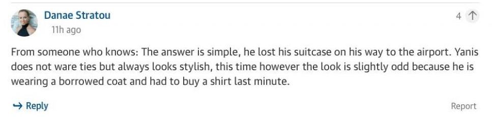 Όπως εξηγεί έχασε την βαλίτσα του στο αεροδρόμιο και γι αυτό αναγκάστηκε να δανειστεί ένα μπουφάν και να αγοράσει ένα πουκάμισο. Επισημαίνει πάντως ότι ούτως ή άλλως δεν φοράει γραβάτα.