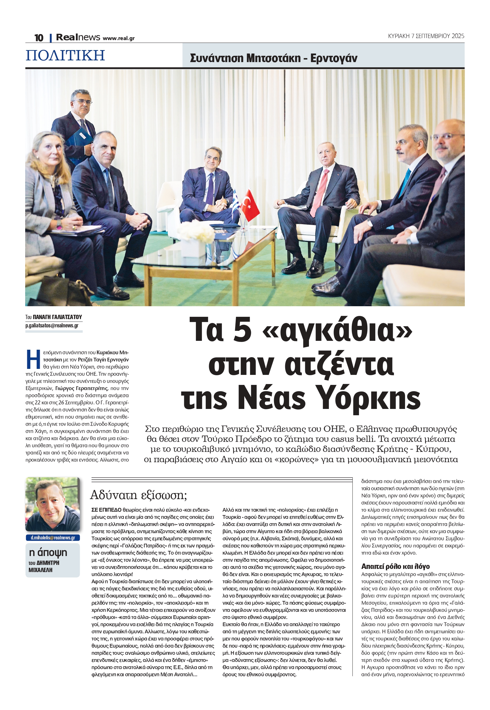 Κορυφαία πρόκληση των Τούρκων η απαίτηση να ελέγχουν όλους τους διαδρόμους στη νοτιοανατολική Μεσόγειο. Η επόμενη συνάντηση του Κυριάκου Μητσοτάκη με τον Ρετζέπ Ταγίπ Ερντογάν θα γίνει στη Νέα Υόρκη, στο περιθώριο της Γενικής Συνέλευσης του ΟΗΕ. Την προανήγγειλε με τηλεοπτική του συνέντευξη ο υπουργός Εξωτερικών, Γιώργος Γεραπετρίτης, που την προσδιόρισε χρονικά στο διάστημα ανάμεσα στις 22 και στις 26 Σεπτεμβρίου.