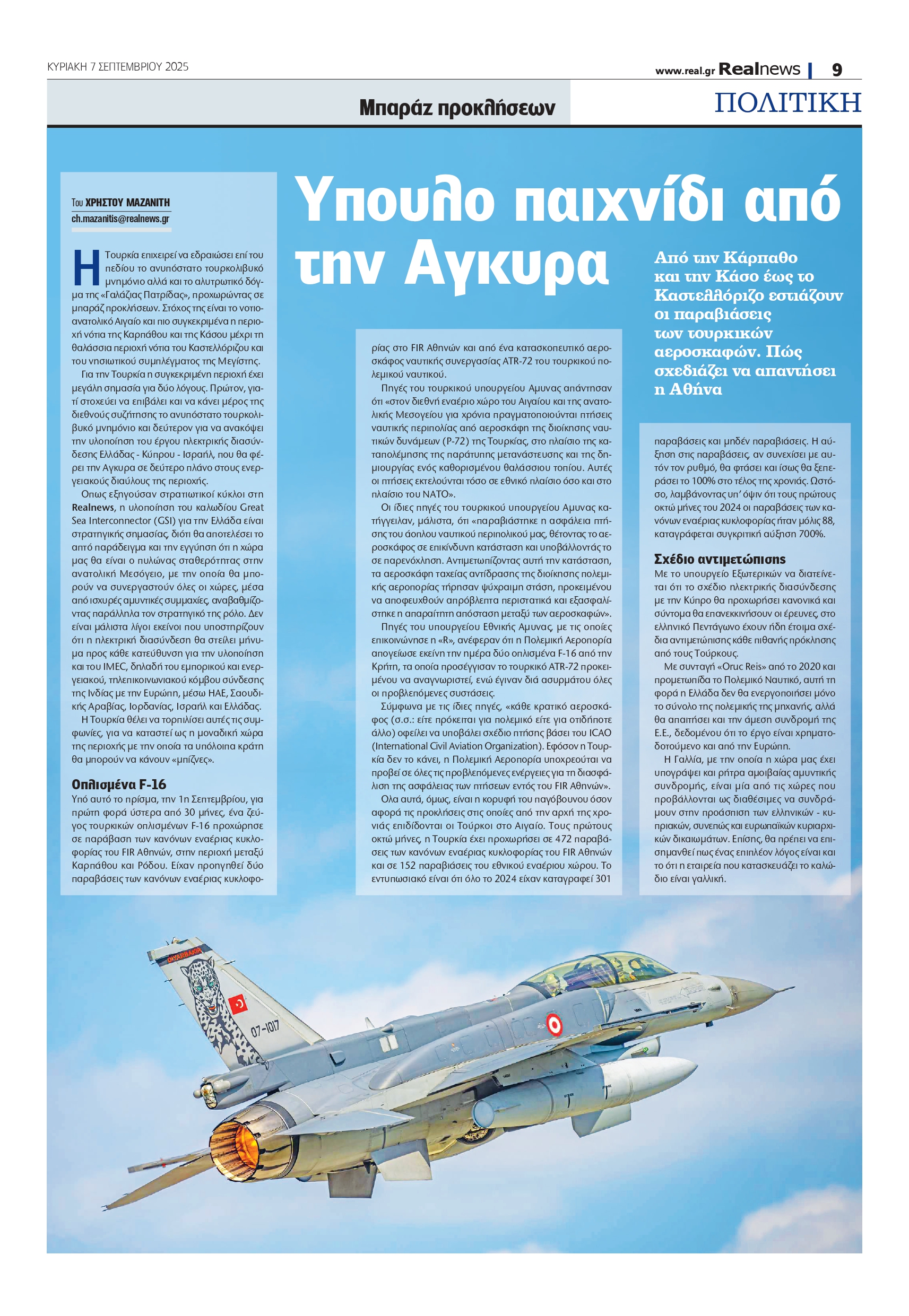 Αυτές οι πτήσεις εκτελούνται τόσο σε εθνικό πλαίσιο όσο και στο πλαίσιο του ΝΑΤΟ». Οι ίδιες πηγές του τουρκικού υπουργείου Άμυνας κατήγγειλαν, μάλιστα, ότι «παραβιάστηκε η ασφάλεια πτήσης του άοπλου ναυτικού περιπολικού μας, θέτοντας το αεροσκάφος σε επικίνδυνη κατάσταση και υποβάλλοντάς το σε παρενόχληση. Αντιμετωπίζοντας αυτή την κατάσταση, τα αεροσκάφη ταχείας αντίδρασης της διοίκησης πολεμικής αεροπορίας τήρησαν ψύχραιμη στάση, προκειμένου να αποφευχθούν απρόβλεπτα περιστατικά και εξασφαλίστηκε η απαραίτητη απόσταση μεταξύ των αεροσκαφών». Πηγές του υπουργείου Εθνικής Αμυνας, με τις οποίες επικοινώνησε η «R», ανέφεραν ότι η Πολεμική Αεροπορία απογείωσε εκείνη την ημέρα δύο οπλισμένα F-16 από την Κρήτη, τα οποία προσέγγισαν το τουρκικό ATR-72 προκειμένου να αναγνωριστεί, ενώ έγιναν διά ασυρμάτου όλες οι προβλεπόμενες συστάσεις.