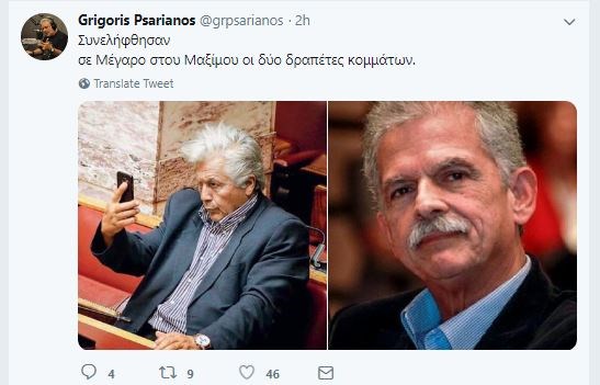 “Συνελήφθησαν σε Μέγαρο στου Μαξίμου οι δύο δραπέτες κομμάτων” έγραψε ο κ. Ψαριανός, αντλώντας προφανώς έμπνευση από τη σύλληψη των δύο κρατουμένων που είχαν αποδράσει από τις φυλακές Κορυδαλλού και συνελήφθησαν. Την ανάρτησή του συνόδευσε με μια φωτογραφία του Σπύρου Δανέλλη και του Θανάση Παπαχριστόπουλου.