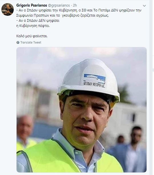 Και δεν σταμάτησε σε αυτό το tweet αλλά συνέχισε: “Αν ο Σπύρος Δανέλλης ψηφίσει την Κυβέρνηση, ο Σταύρος Θεοδωράκης και Το Ποτάμι δεν ψηφίζουν την Συμφωνία των Πρεσπών και το γκουβέρνο ζορίζεται αγρίως. – Αν ο Σπύρος Δανέλλης δεν ψηφίσει η Κυβέρνηση πέφτει. Καλό μού φαίνεται”