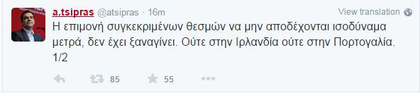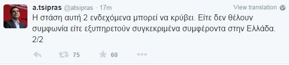«Η επιμονή συγκεκριμένων θεσμών να μην αποδέχονται ισοδύναμα μετρά, δεν έχει ξαναγίνει. Ούτε στην Ιρλανδία ούτε στην Πορτογαλία. H στάση αυτή 2 ενδεχόμενα μπορεί να κρύβει. Είτε δεν θέλουν συμφωνία είτε εξυπηρετούν συγκεκριμένα συμφέροντα στην Ελλάδα» έγραψε στο Twitter του ο πρωθυπουργός, Αλέξης Τσίπρας, αφήνοντας αιχμές για το ΔΝΤ.