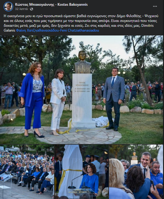 Μετά τα αποκαλυπτήρια της προτομής, ο Δήμαρχος Αθηναίων, Κώστας Μπακογιάννης έκανε ανάρτηση στην προσωπική του σελίδα στο Facebook, γράφοντας χαρακτηριστικά: «Η οικογένεια μου κι εγώ προσωπικά είμαστε βαθιά ευγνώμονες στον Δήμο Φιλοθέης – Ψυχικού και σε όλους εσάς που μας τιμήσατε με την παρουσία σας απόψε. Είναι συγκινητικό που τόσες δεκαετίες μετά, μαζί με εμάς, δεν ξεχνάτε κι εσείς. Ζει στις καρδιές και στις ιδέες μας».
