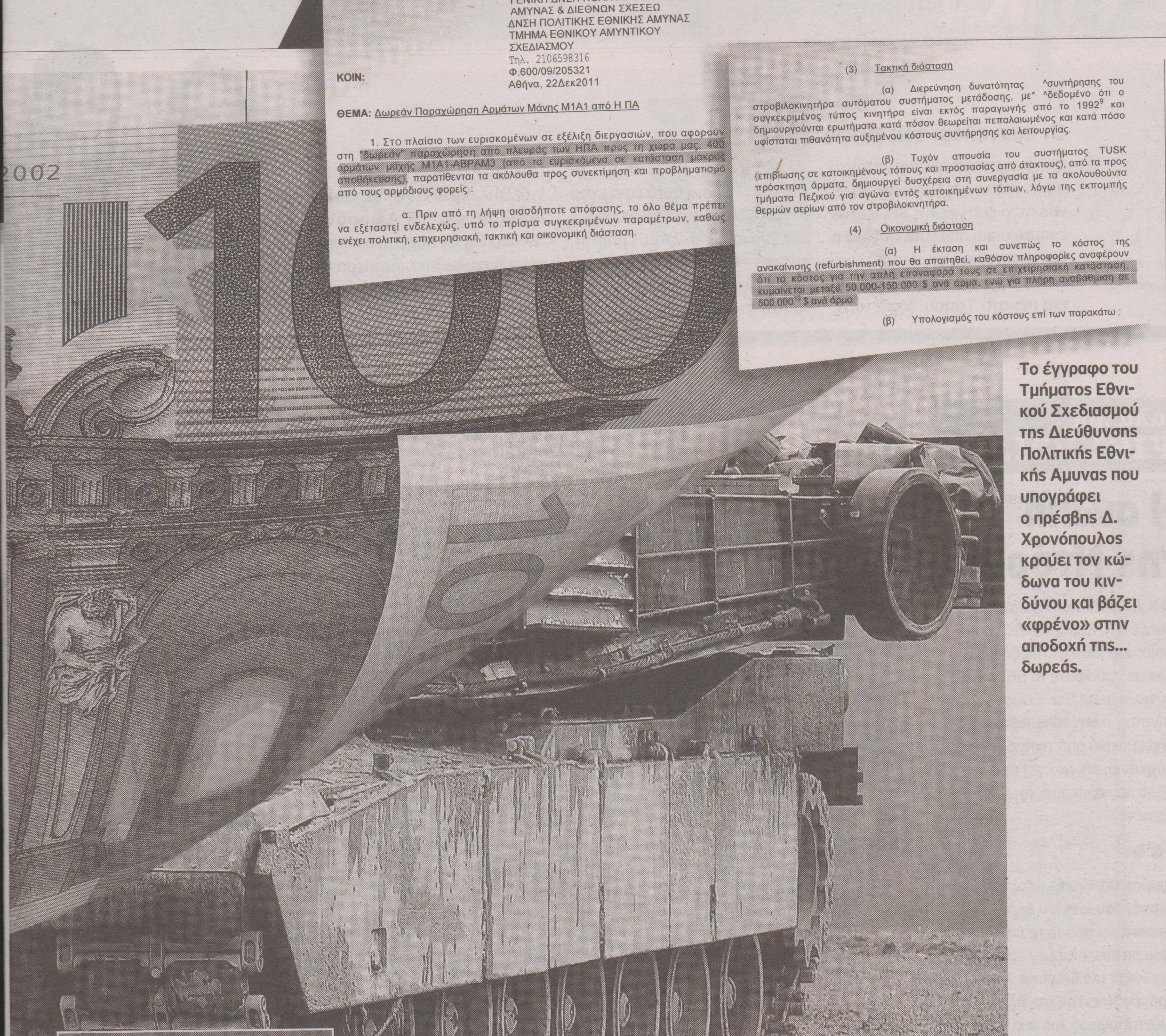 Την ίδια ώρα που ο Πάνος Παναγιωτόπουλος ως υπουργός Αμυνας υπόσχεται στην τρόικα ότι θα περιορίσει στο ελάχιστο τις εξοπλιστικές δαπάνες, ένα “αόρατο χέρι”, όπως αναφέρεται χαρακηριστικά στο Εθνος της Κυριακής, σπρώχνει το Πεντάγωνο στο να δεχτεί μια ασύμφορη… δωρεά 400 αμερικανικών αρμάτων Abrams που βρίσκονται παροπλισμένα στα νεκροταφεία αρμάτων στη Νεβάδα.Στόχος να αναλάβουν τη θαλάσσια μεταφορά των συγκεκριμένων αρμάτων από τις ΗΠΑ στην Ελλάδα εισπράττοντας αρκετά εκατομμύρια ευρώ.Στο Πεντάγωνο, σύμφωνα πάντα με την εφημερίδα, είναι διάχυτη η αίσθηση ότι καταβάλλεται λυσσαλέα προσπάθεια για αποδοχή της… δωρεάς των αμερικανικών αρμάτων από συγκεκριμένα συμφέροντα που επί χρόνια λυμαίνονται τις θαλάσσιες μεταφορές αμυντικού υλικού.