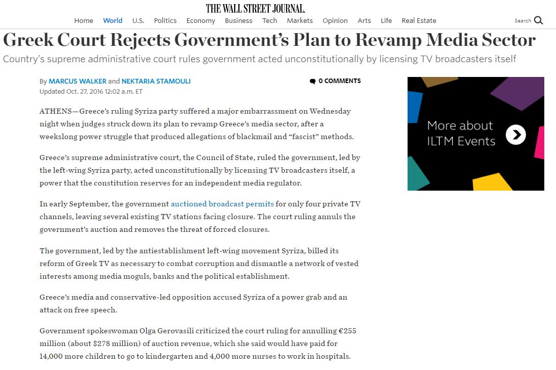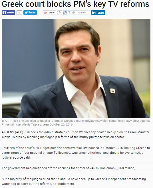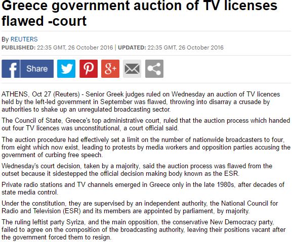 «Η απόφαση είναι ένα επώδυνο πλήγμα στην ακροαριστερή κυβέρνηση ΣΥΡΙΖΑ που είχε ανακοινώσει με μεγάλη φανφάρα τη μεταρρύθμιση, υποστηρίζοντας ότι θα καθαρίσει το ραδιοτηλεοπτικό τοπίο από τους ισχυρούς ολιγάρχες», γράφει το Γαλλικό Πρακτορείο Ειδήσεων.