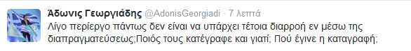 «Λίγο περίεργο πάντως δεν είναι να υπάρχει τέτοια διαρροή εν μέσω της διαπραγματεύσεως; Ποιός τους κατέγραφε και γιατί; Πού έγινε η καταγραφή;», έγραψε στο Twitter ο αντιπρόεδρος της Νέας Δημοκρατίας, Άδωνις Γεωργιάδης, στον απόηχο των αποκαλύψεων της συνομιλίας Τόμσεν – Βελκουλέσκου.