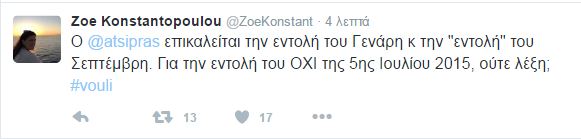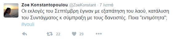 «Οι εκλογές του Σεπτέμβρη έγιναν με εξαπάτηση του λαού, κατάλυση του Συντάγματος και σύμπραξη με τους δανειστές. Ποια “εντιμότητα”;» γράφει στο Twitter η Ζωή Κωνσταντοπούλου, ενώ σε άλλη ανάρτηση κάνει αναφορά στο δημοψήφισμα του καλοκαιριού.